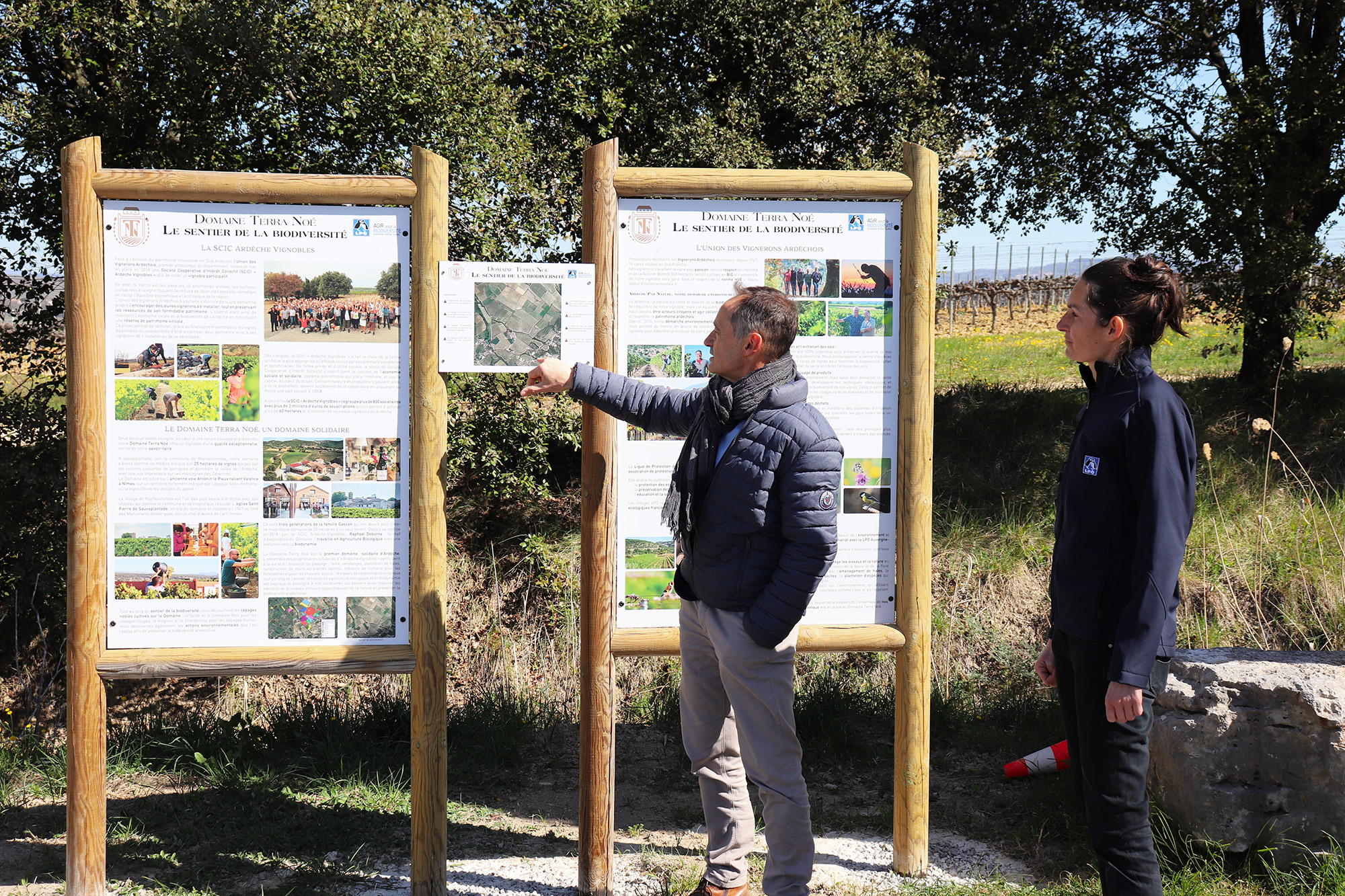 Tout au long de ce sentier, vous retrouverez des panneaux ludiques et explicatifs pour comprendre le vignoble et découvrir nos différents cépages. Au cours du sentier, vous passerez aussi dans le village de Sauveplantade et pourrez admirer cette architecture romaine ainsi que la plus petite église de la chrétienté : l’église Saint-Pierre, bâtie à la fin du XIème siècle et classée monument historique depuis 1907.Pour finir, une aire de détente avec une vue magnifique se trouve sur la partie haute du Domaine. Vous pourrez y observer les paysages et montagnes ardéchoises. Une vue d’ensemble qui permet de comprendre la signification de « Terra Noé »…
