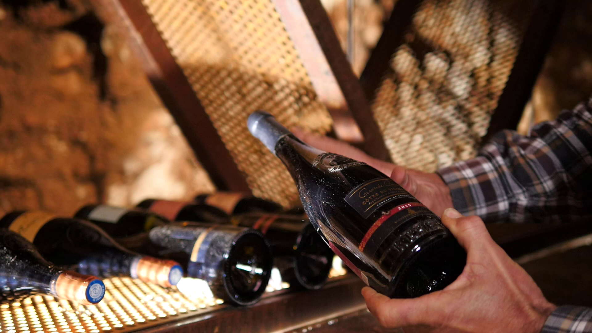 A unique moment in the recently refurbished wine cellar, where 15,000 bottles, including Grand Aven, have been ageing since 2018.