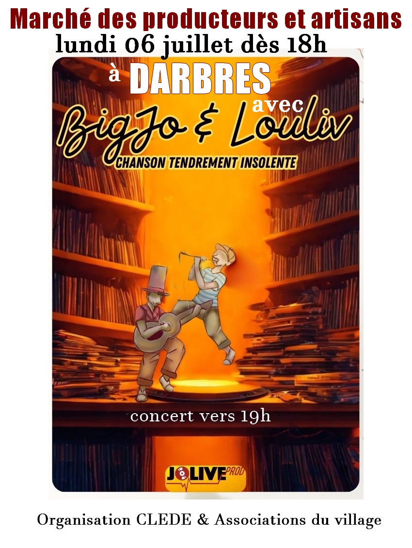 As part of the producers' and artisans' market, the Clede association is organizing and offering you a concert by Big Jo & l'Oliv (French song).