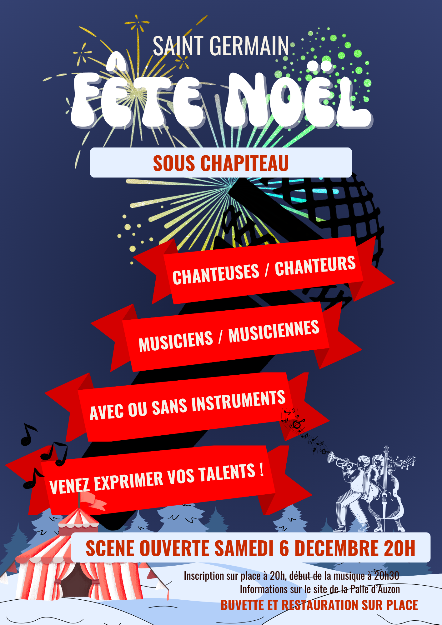 Saturday, December 6th, registration at 8 pm under the big top, open stage.