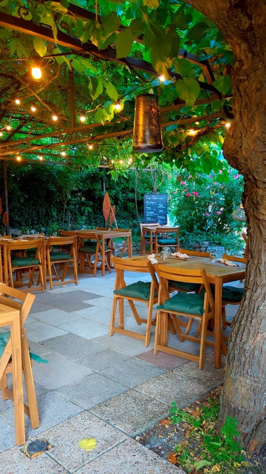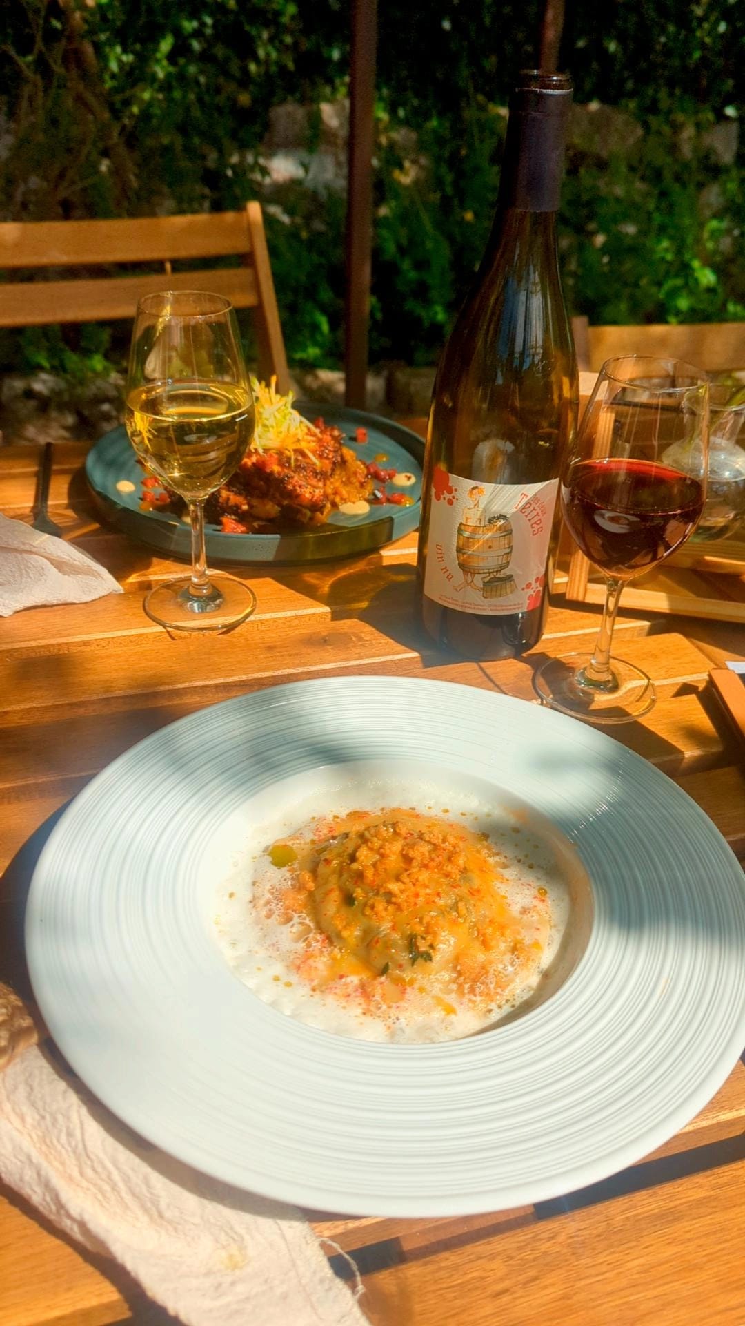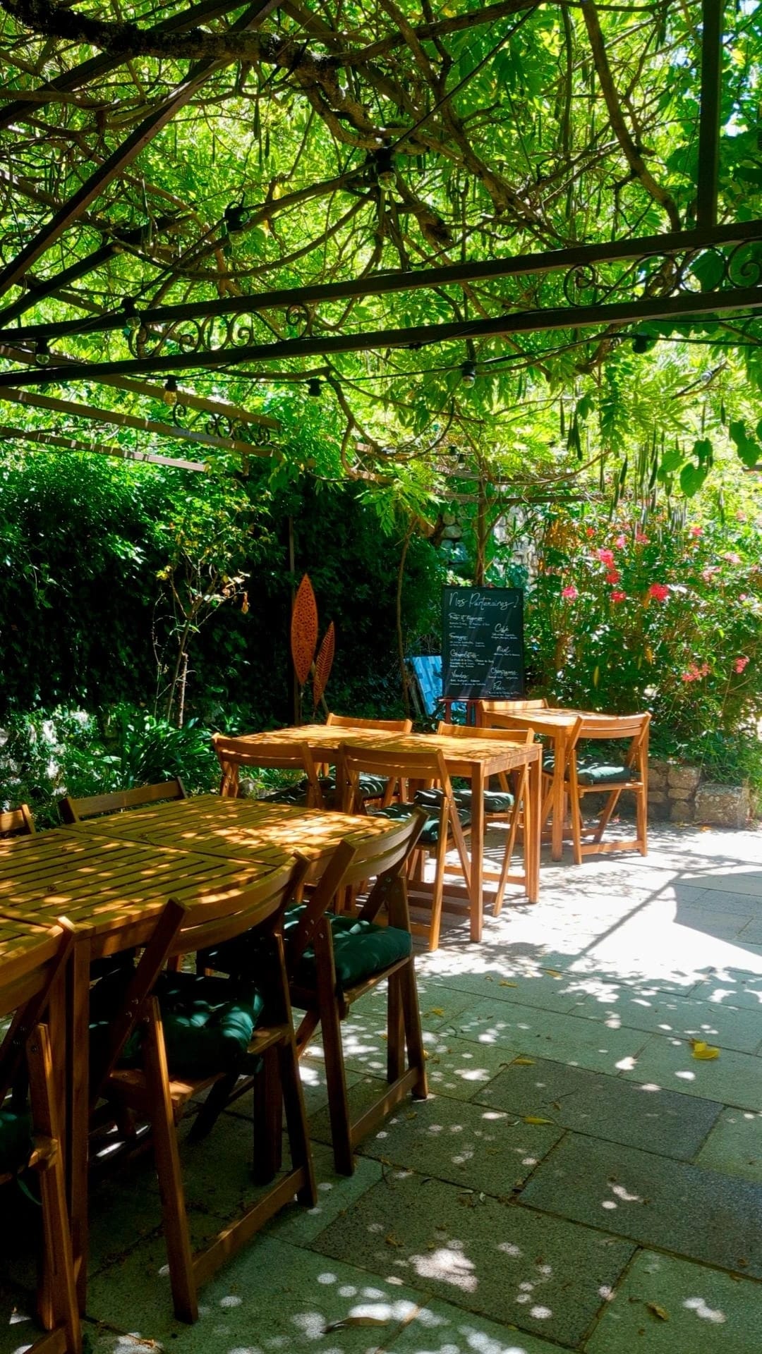 A welcoming and warm atmosphere where time stands still, surrounded by flavorful and colorful dishes, fine bottles of natural or organic wines, and music mingling with birdsong.