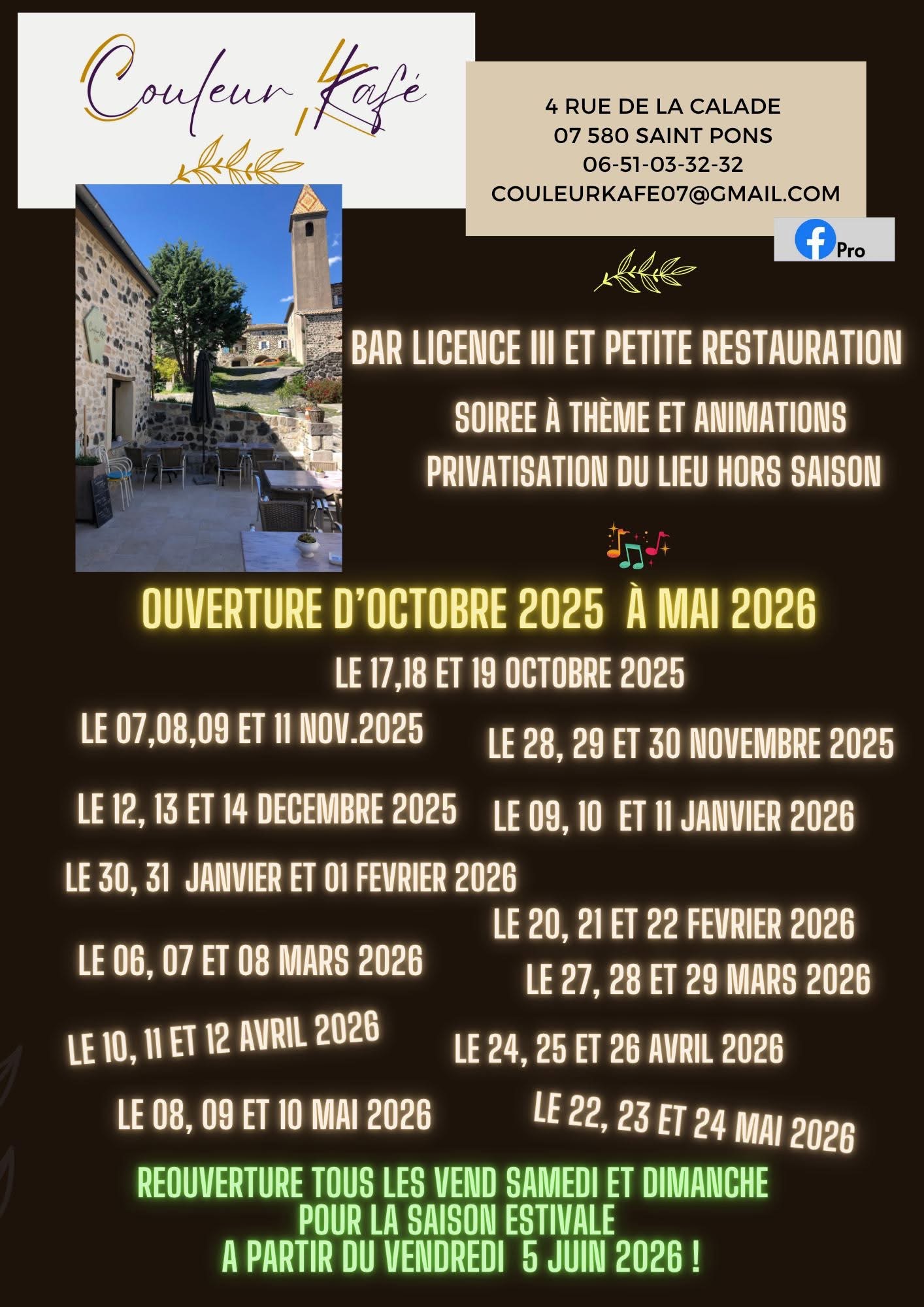 I offer themed evenings with reservations required for meals, featuring live music (concerts, karaoke). Homemade ice cream is available in the summer. Large television screen broadcasts sporting events.