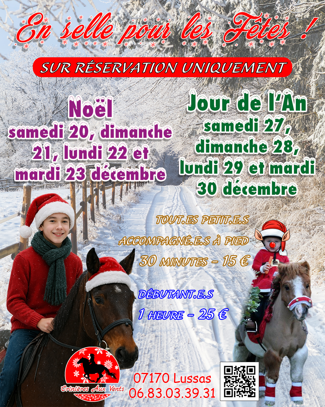 Experience the magic of the holidays on horseback! For Christmas and New Year's, I offer festive, costumed horseback rides, suitable for all levels, in a fun and friendly atmosphere. Reservations required – limited spaces available!