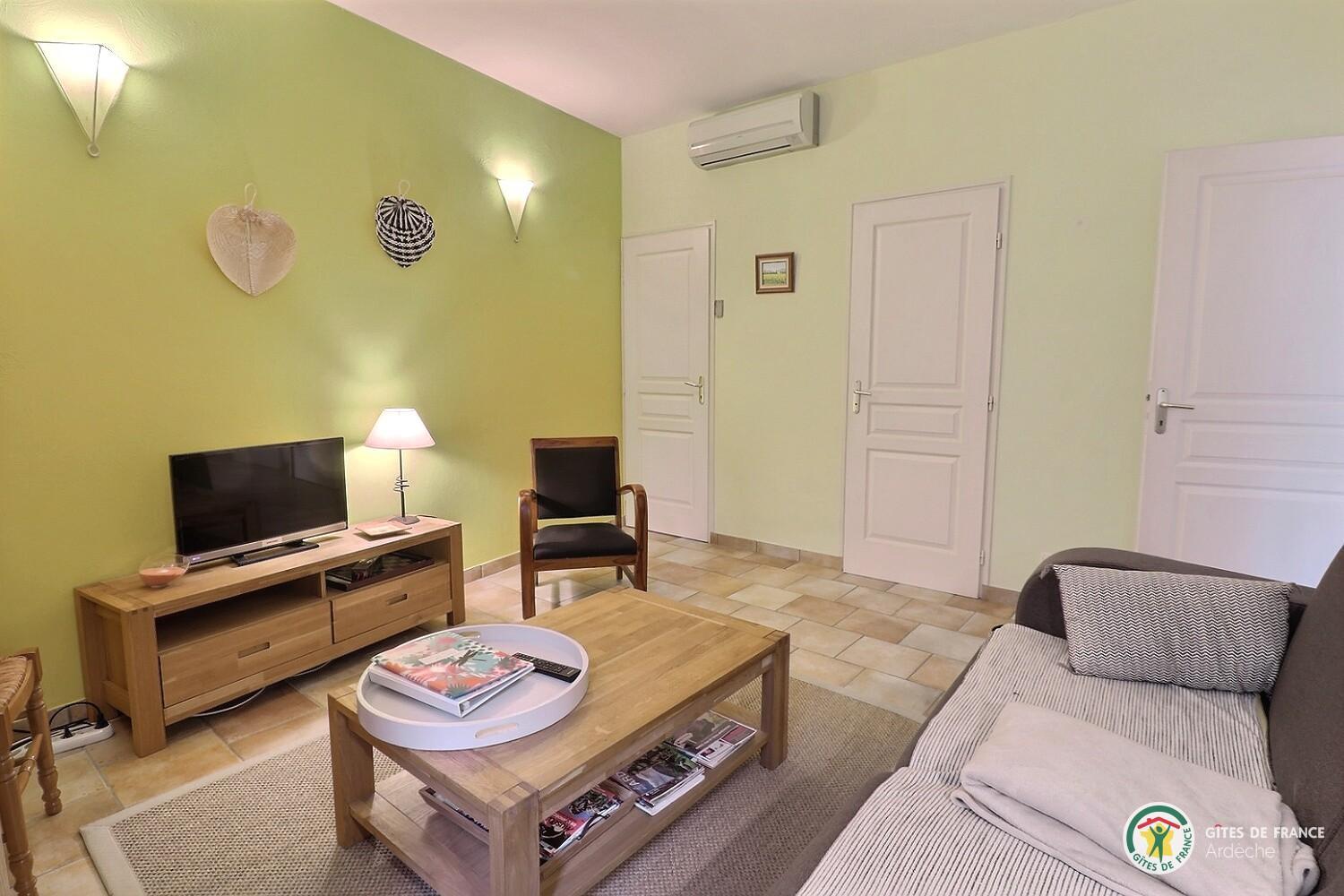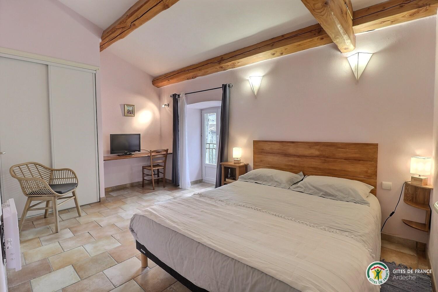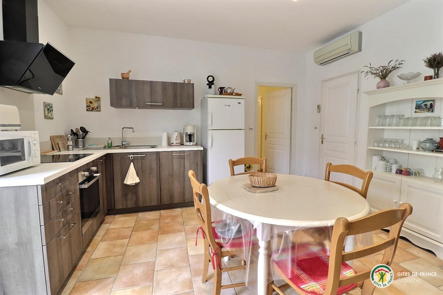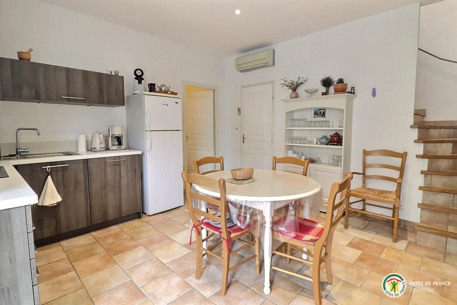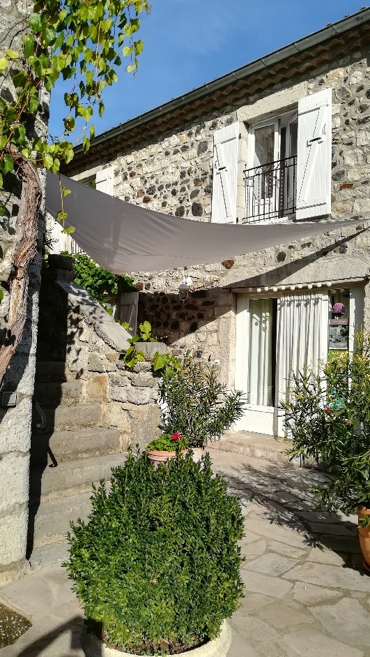 In the heart of a small medieval village in the southern Ardèche surrounded by vineyards (recently retired wine-growers) and dominated by its original bell tower, you can rent this gîte for 4 people (and 1 sup possible) in an outbuilding of our house. house (traditional stone house from 1822 completely renovated). This 80 m² gite includes 4 rooms: an equipped living kitchen: oven, microwave, hob, extractor, dishwasher ….., a living room with sofa, armchair, TV, coffee table and library, shower room with wc on the ground floor. Upstairs: 2 bedrooms for 2 people, 1 with a 160 cm bed and the other with 2 90 cm beds which could be gathered), each bedroom has its own bathroom (shower, basin and wc). Cot and high chair on request. Additional equipment: washing machine, air conditioning, electric heating, Outside: 25 m² private terrace with table, chairs, deckchair and barbecue; private parking in a flowered and closed courtyard. Possibility of catering 10 minutes from the village, grocery store on site. Advantages: sheets provided and beds made, bathroom linen provided on request without supplement.