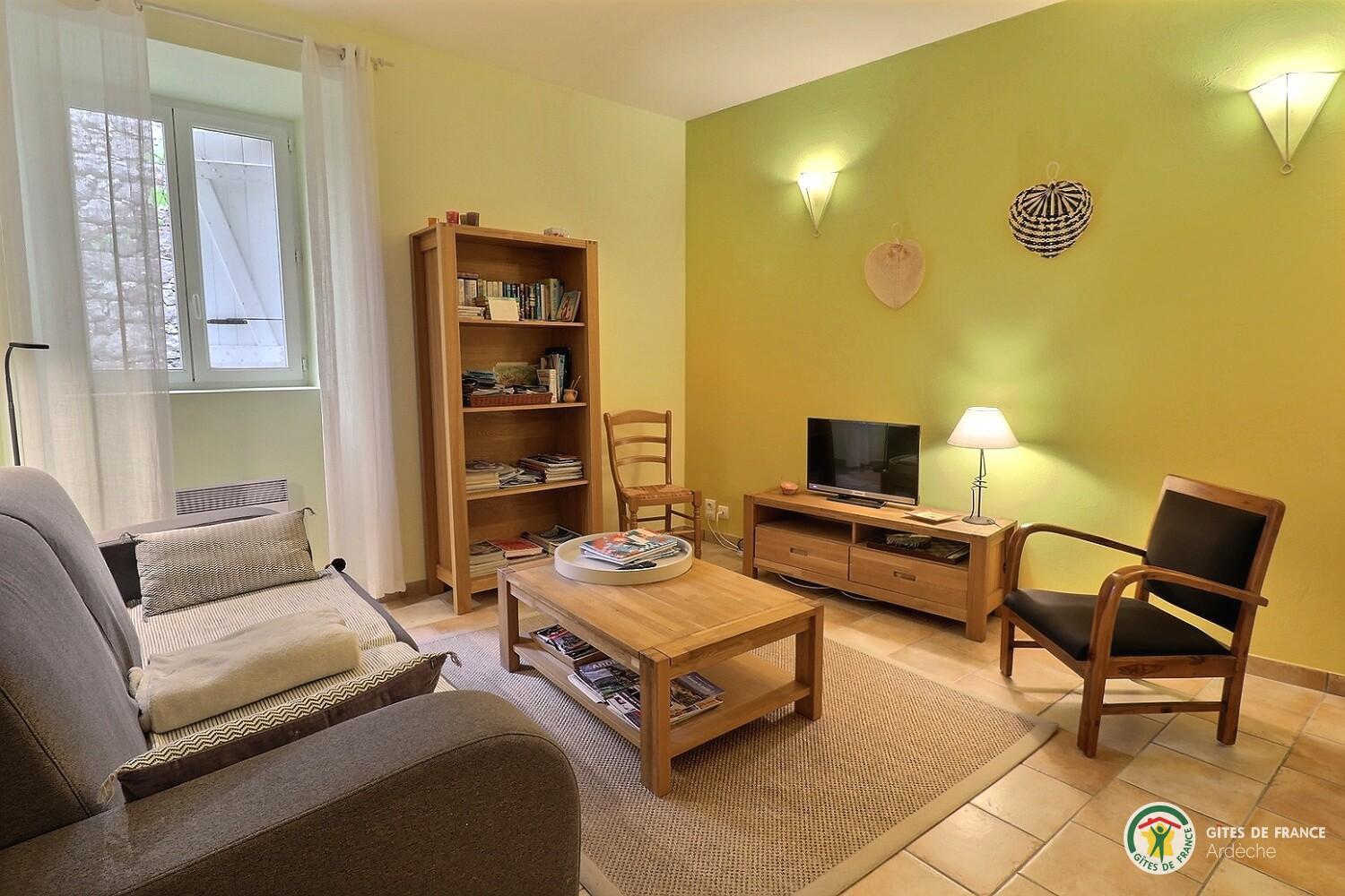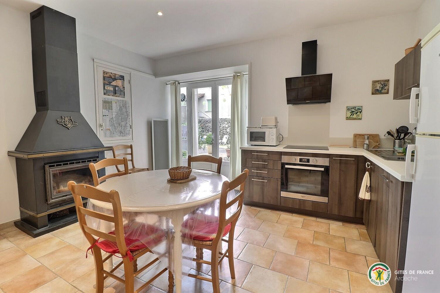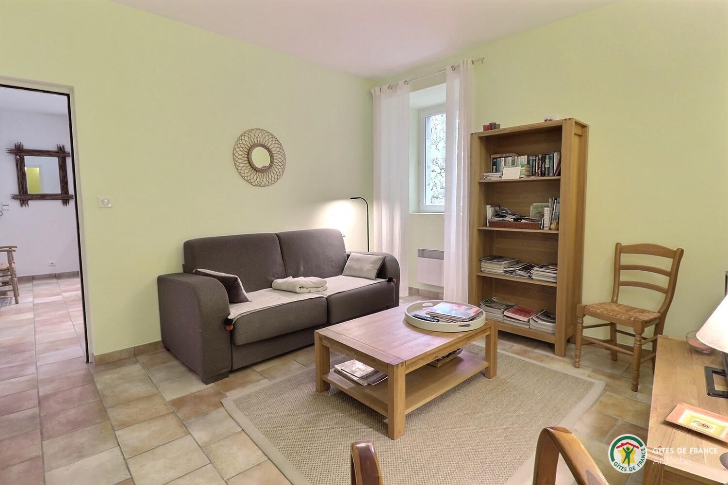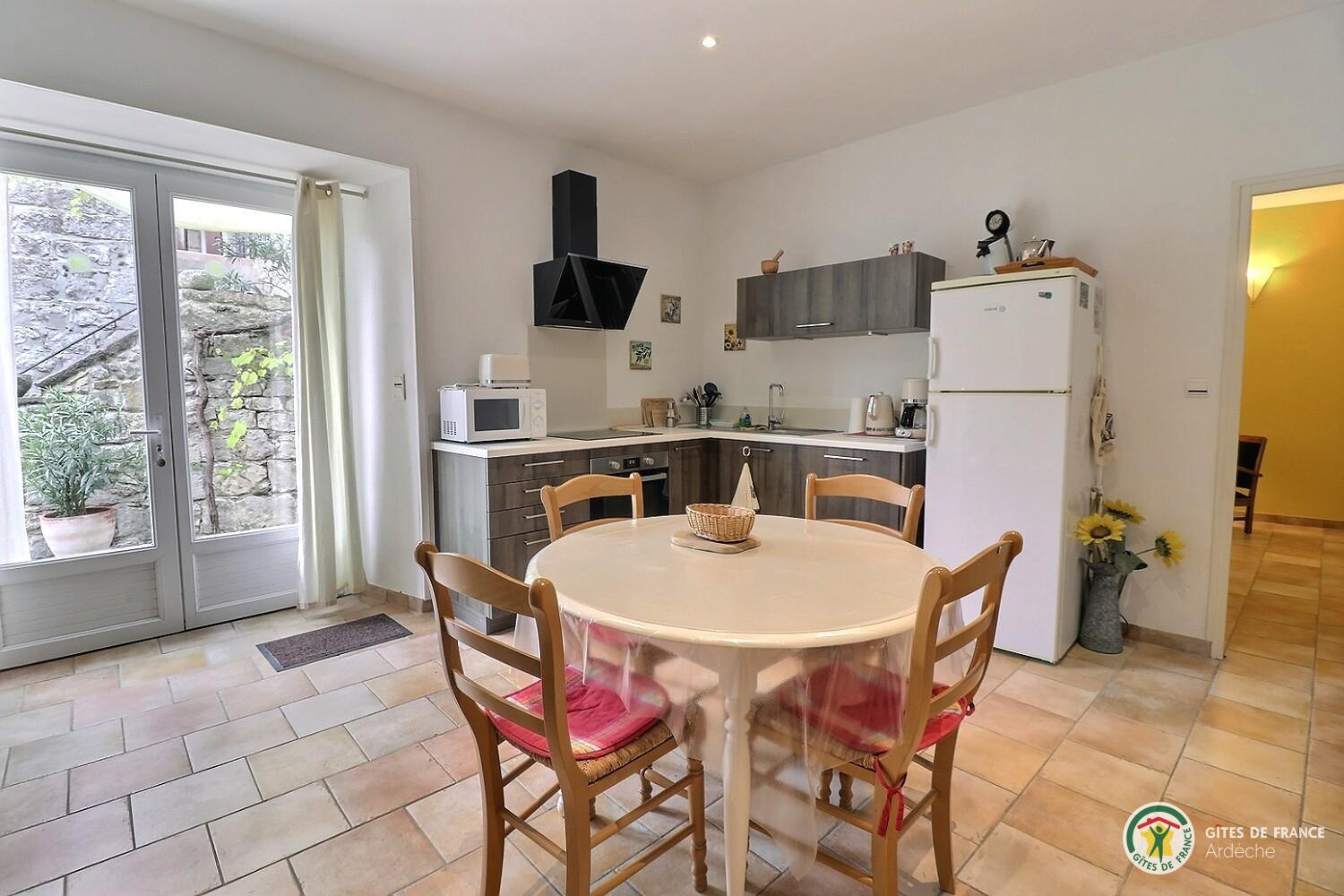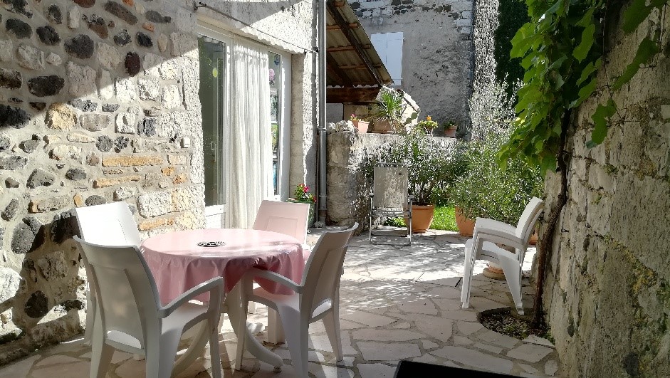 In the heart of a small medieval village in the southern Ardèche surrounded by vineyards (recently retired wine-growers) and dominated by its original bell tower, you can rent this gîte for 4 people (and 1 sup possible) in an outbuilding of our house. house (traditional stone house from 1822 completely renovated). This 80 m² gite includes 4 rooms: an equipped living kitchen: oven, microwave, hob, extractor, dishwasher ….., a living room with sofa, armchair, TV, coffee table and library, shower room with wc on the ground floor. Upstairs: 2 bedrooms for 2 people, 1 with a 160 cm bed and the other with 2 90 cm beds which could be gathered), each bedroom has its own bathroom (shower, basin and wc). Cot and high chair on request. Additional equipment: washing machine, air conditioning, electric heating, Outside: 25 m² private terrace with table, chairs, deckchair and barbecue; private parking in a flowered and closed courtyard. Possibility of catering 10 minutes from the village, grocery store on site. Advantages: sheets provided and beds made, bathroom linen provided on request without supplement.