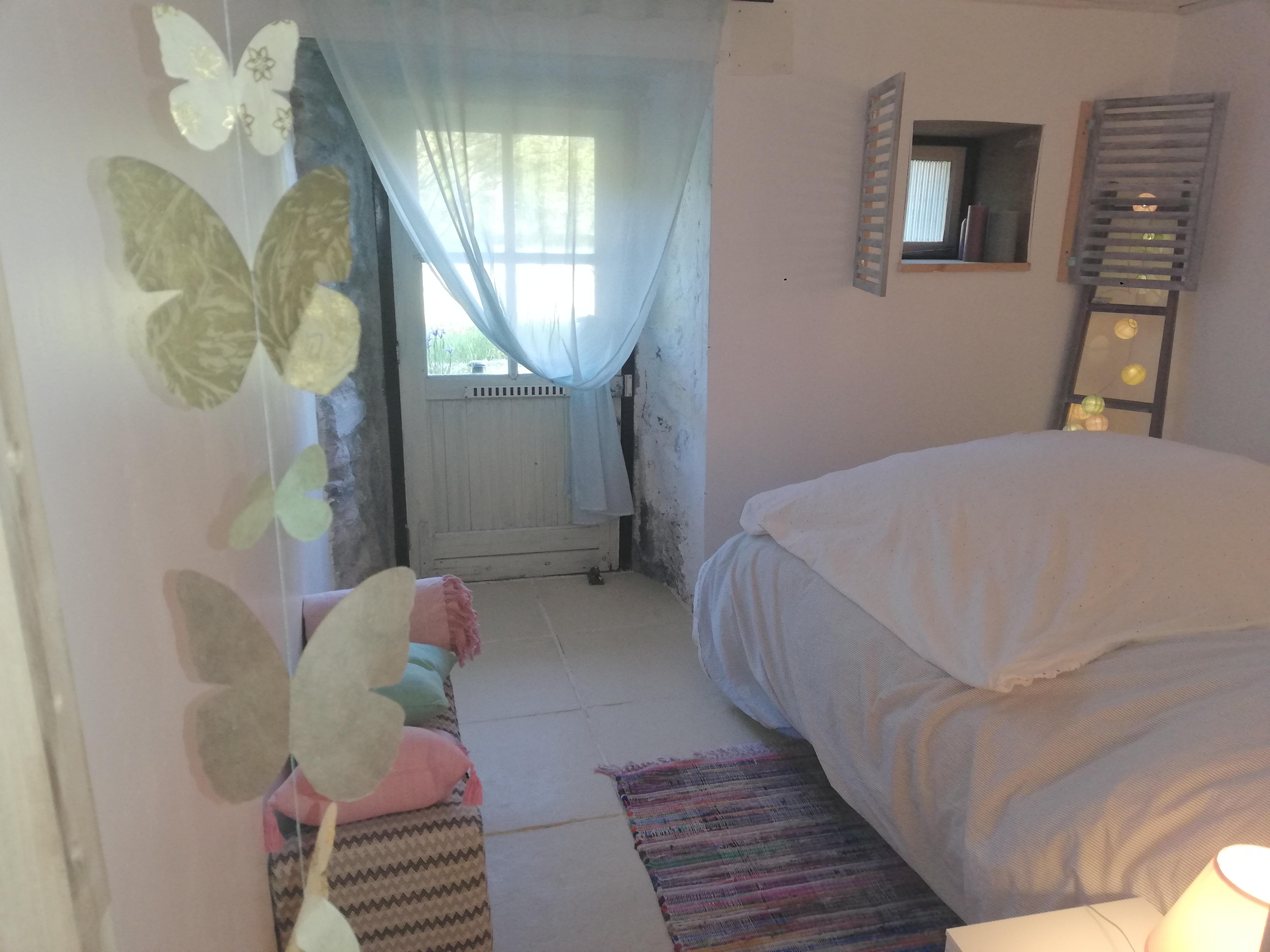 On the ground floor, a functional, well-equipped kitchen, with a gas and wood stove. Then a small bedroom on one level with direct access to the garden.