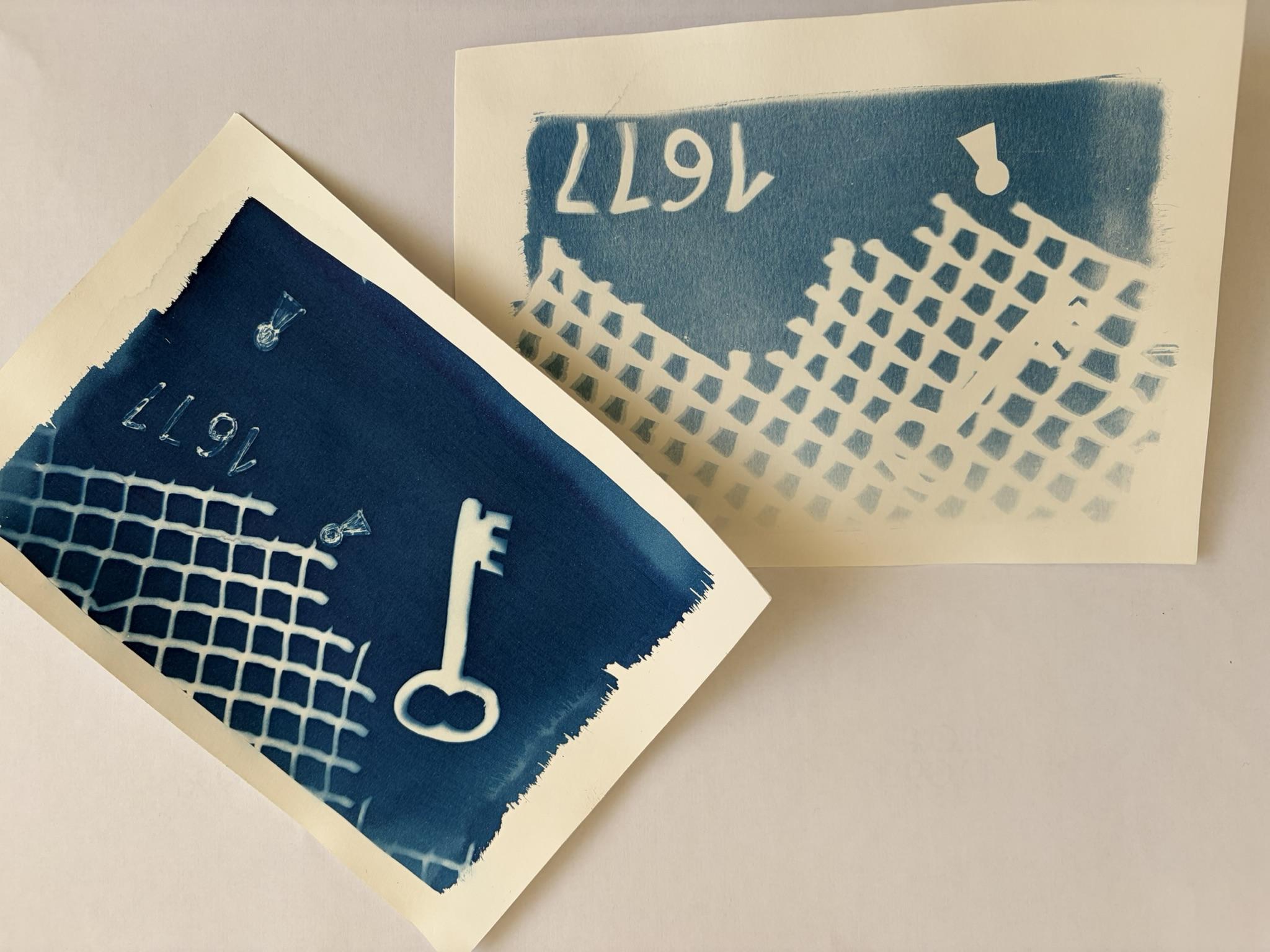 Inspiré par les graffitis des prisons du château et les œuvres de Nicolas Daubanes, créez un cyanotype qui reprend les motifs de l'univers carcéral.