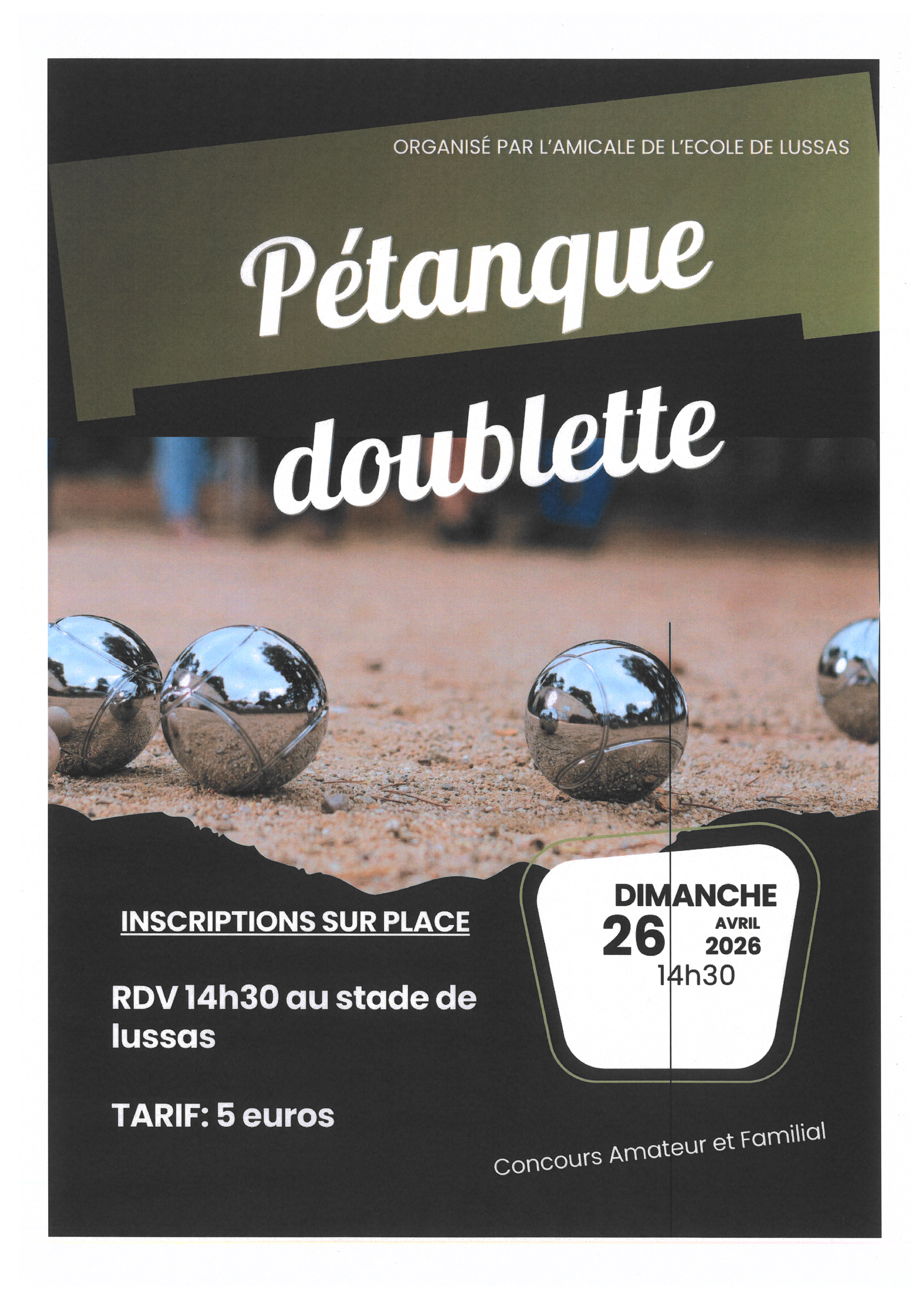 L'amicale de l'école de Lussas organise un concours de pétanque amateur et familial. Inscriptions sur place.