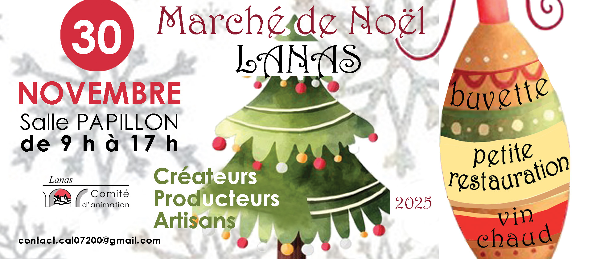 Traditionnel Marché de Noël de Lanas, le dimanche 30 novembre à la Salle Papillon – de 9 h à 17 h à la Salle Papillon – Rencontrez les stands de producteurs, artisans et créateurs. Buvette, Petite restauration, Vin chaud…