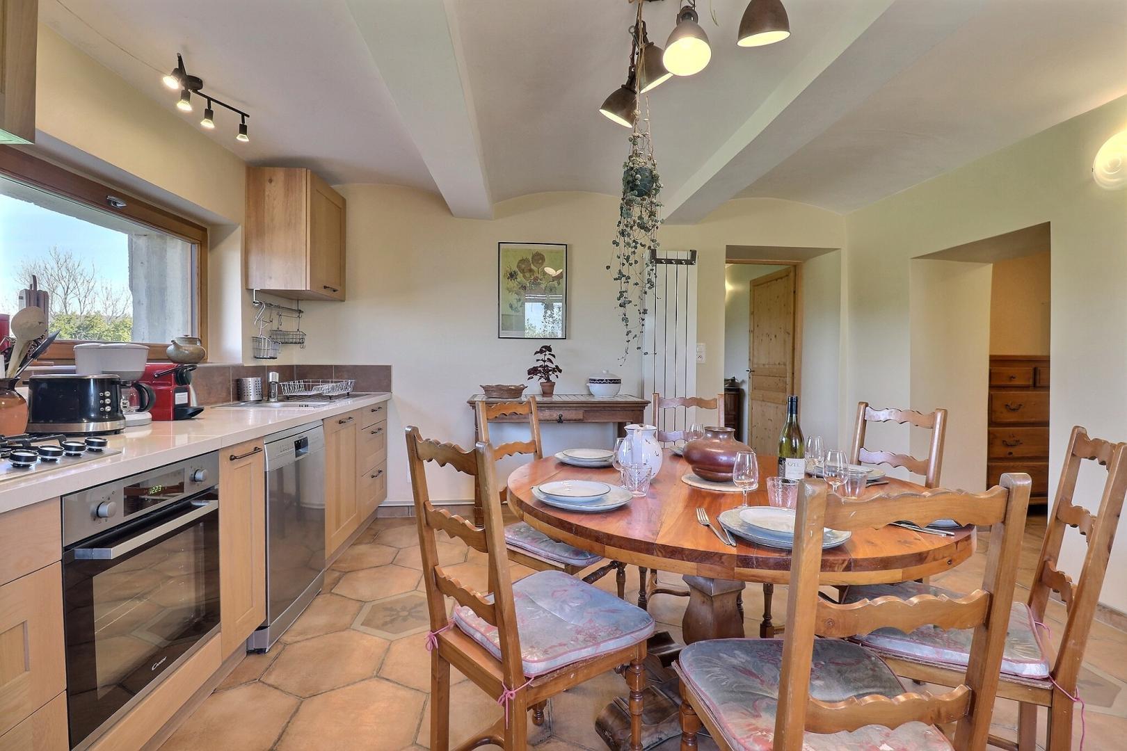 La cuisine donne sur une terrasse plein sud et permet de profiter de la vue dévalante sur la campagne environnante.