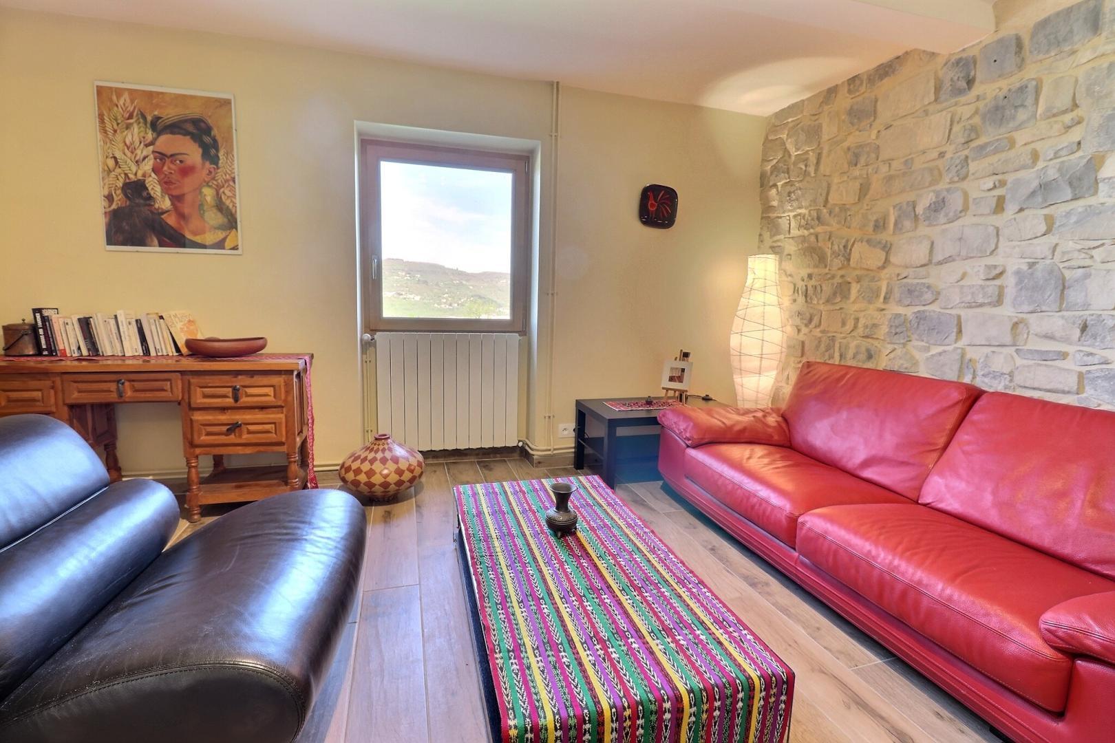 Le salon marie le moderne avec l’ancien grâce à son mur de vieilles pierres.