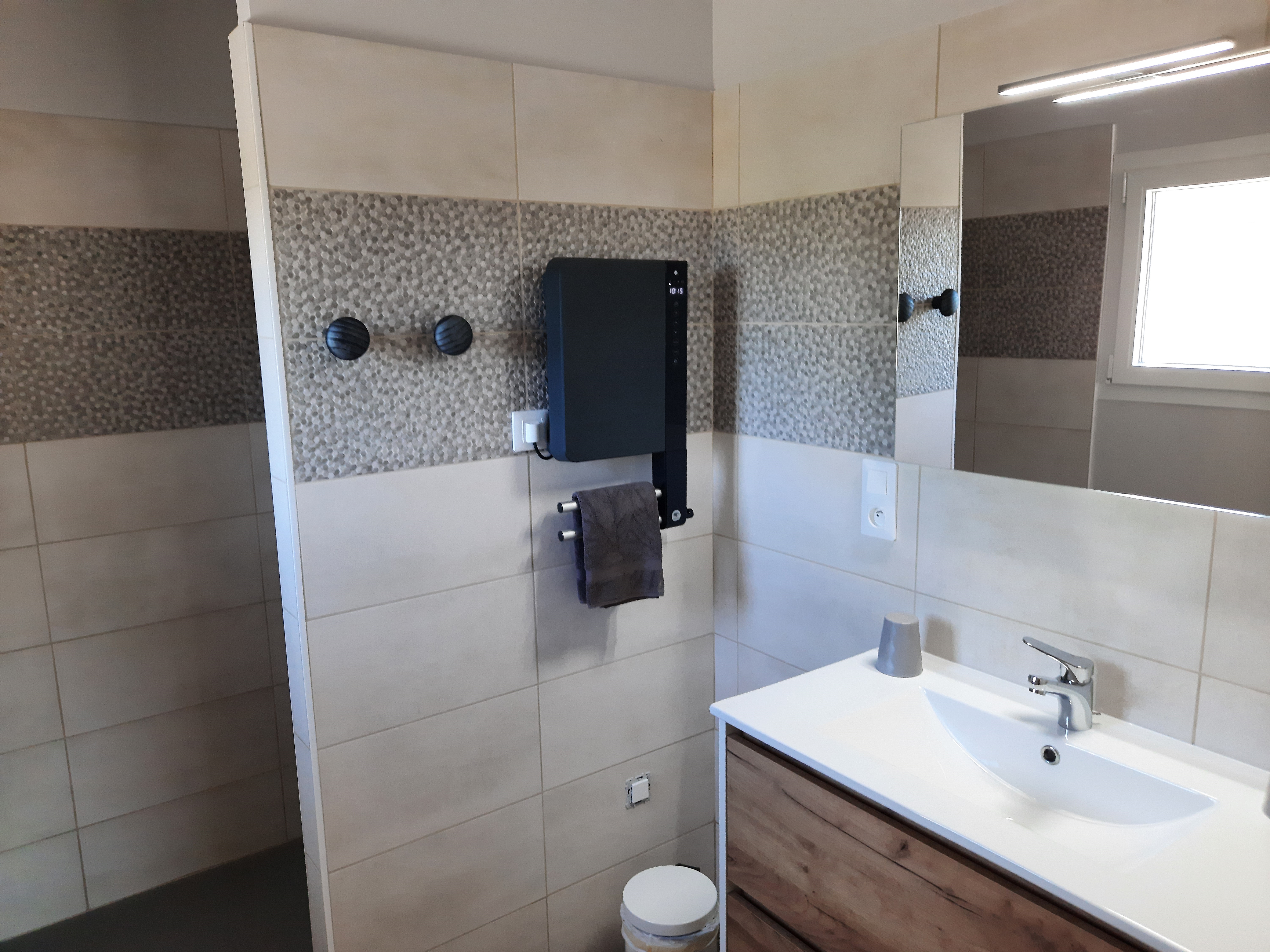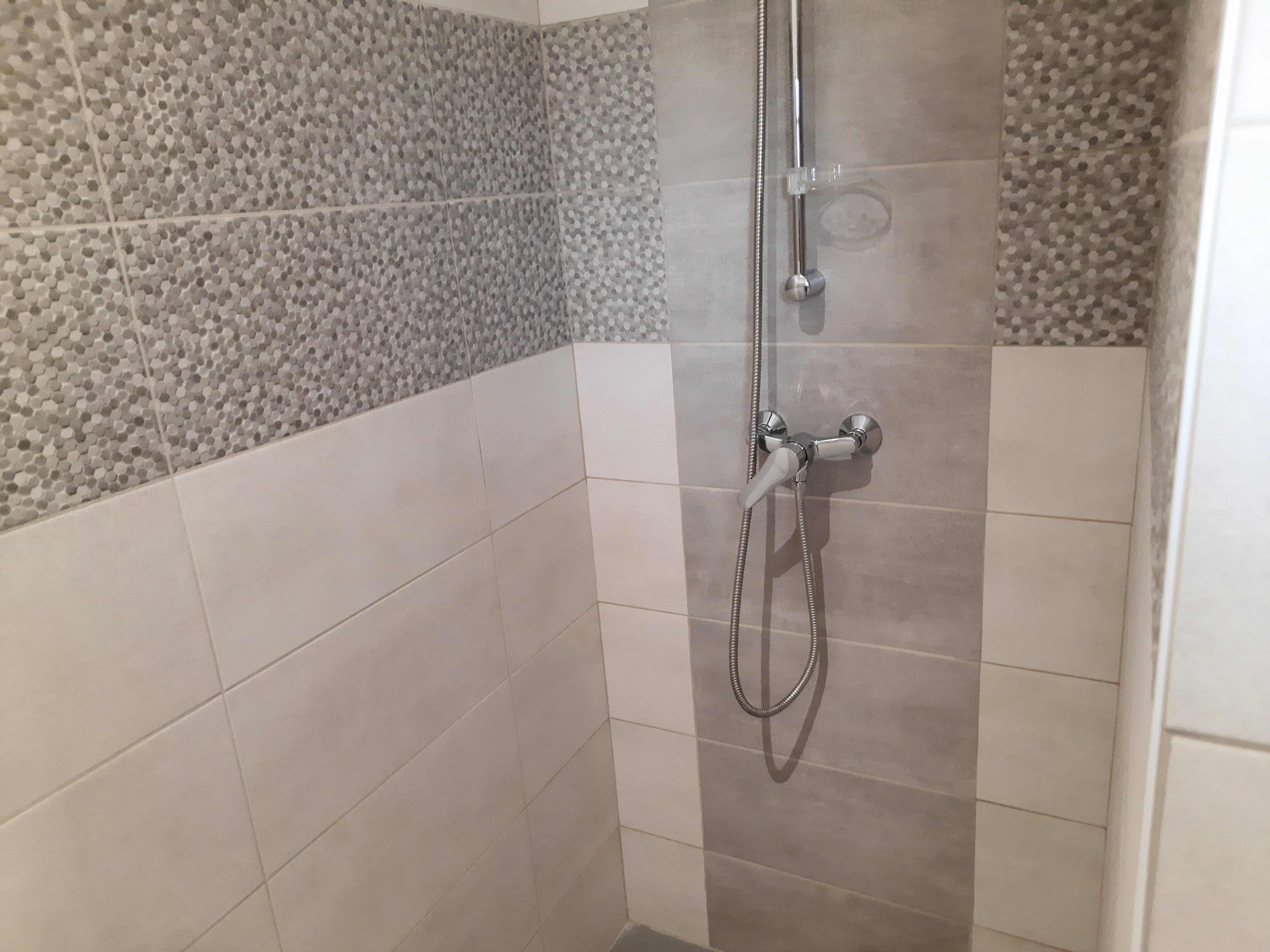 Une douche italienne équipe la salle d’eau, le tout complété par un WC séparé.