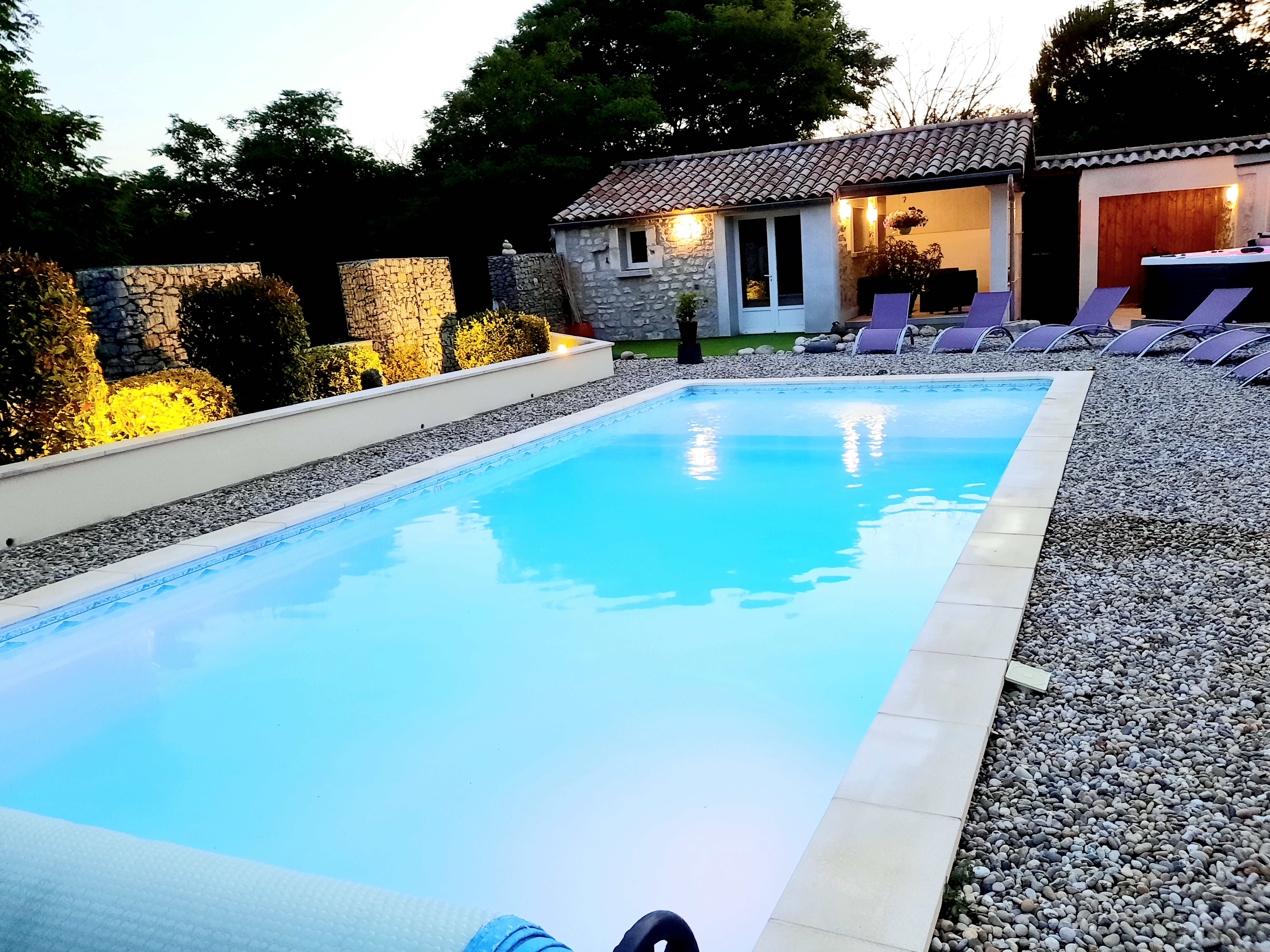 Côté extérieur, la terrasse orientée sud est vous permettra de passer d’agréables moments installés confortablement dans le salon de jardin. Vous avez accès à l’espace bien-être où vous trouverez une piscine et un SPA en accès libre la journée et partagé avec une autre location de 2 personnes et les propriétaires. Après 21h possibilité de privatiser l’espace bien-être sans supplément.