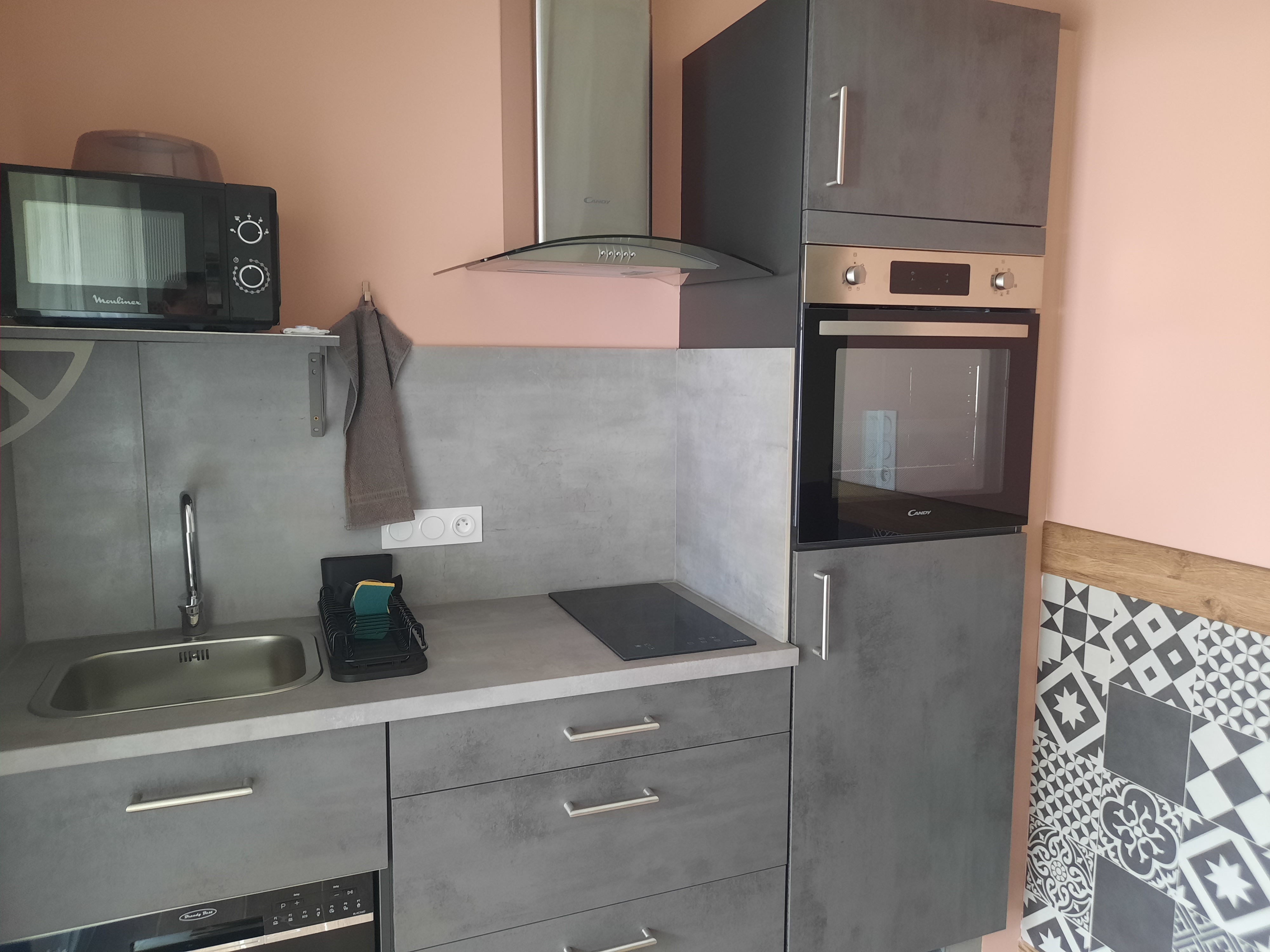 La kitchenette tout équipée est ouverte sur le salon qui dispose d’un coin repas.