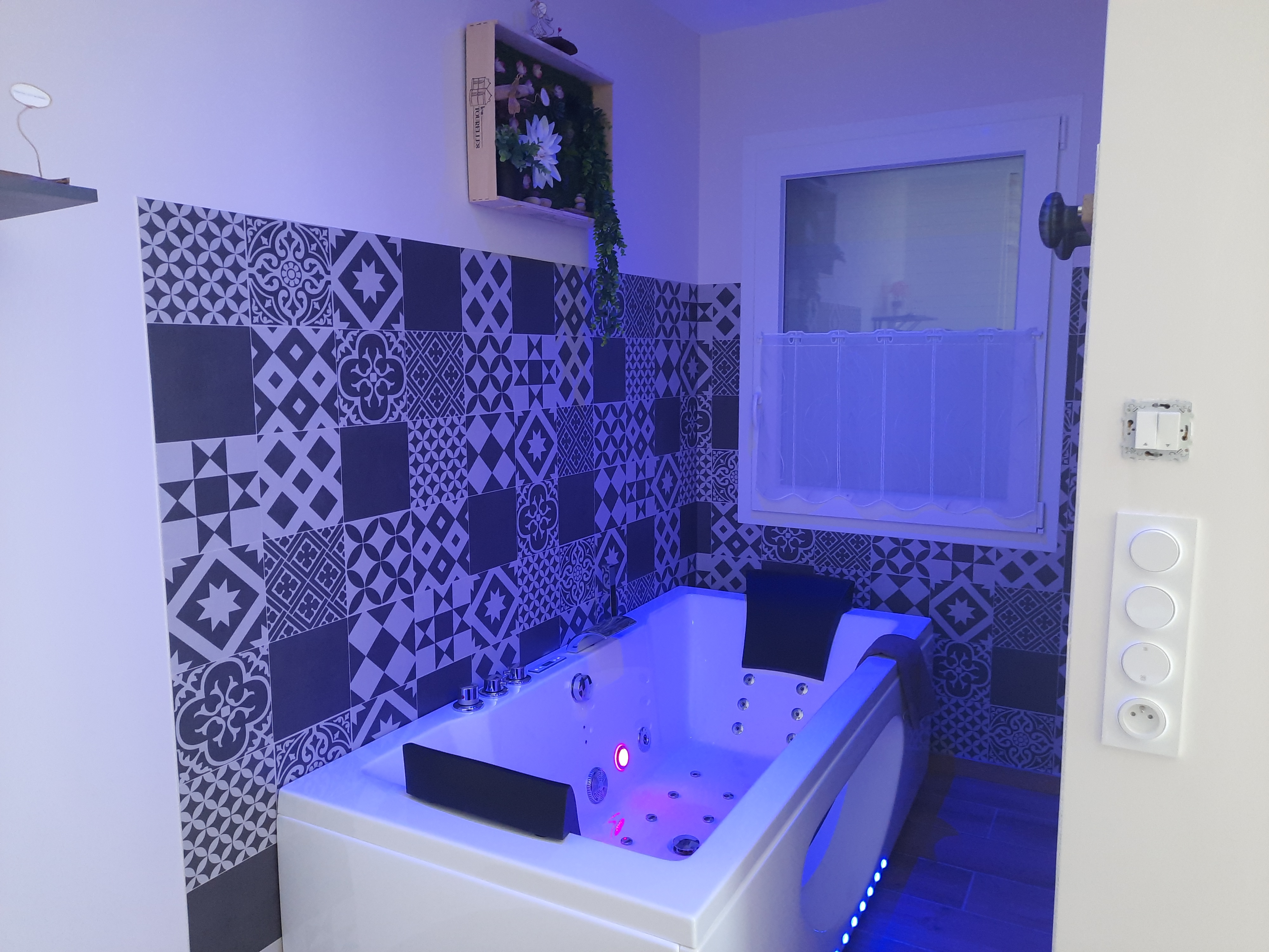Une baignoire balnéo permet de se détendre à souhait tout en profitant de la vue sur la tour de Mirabel.