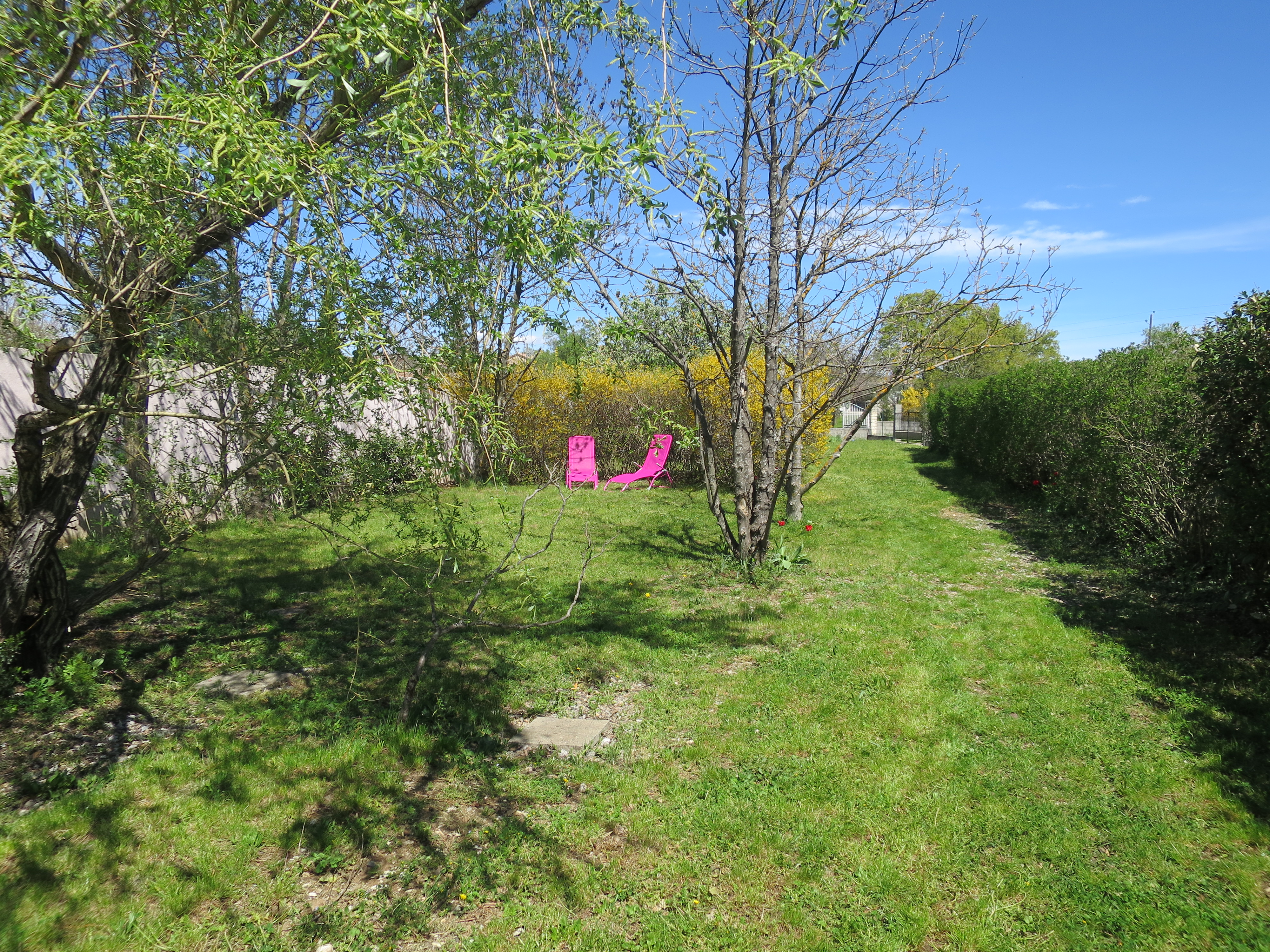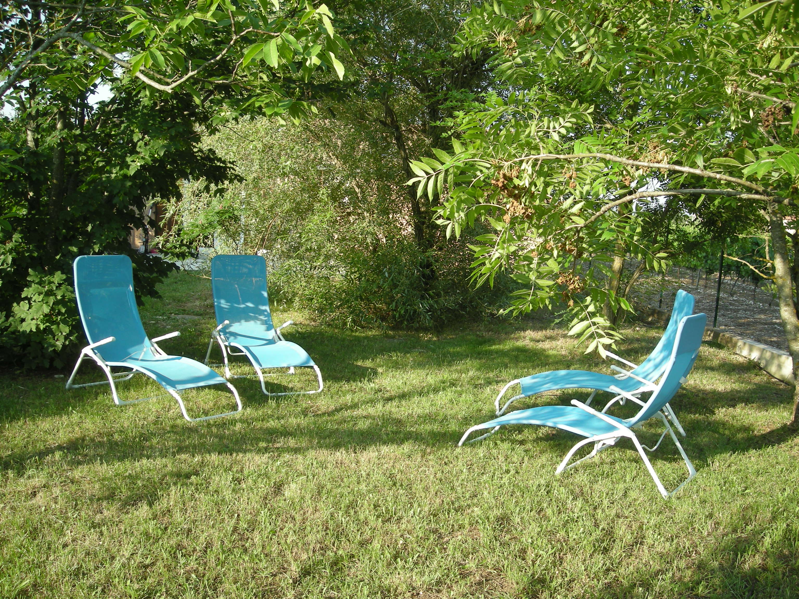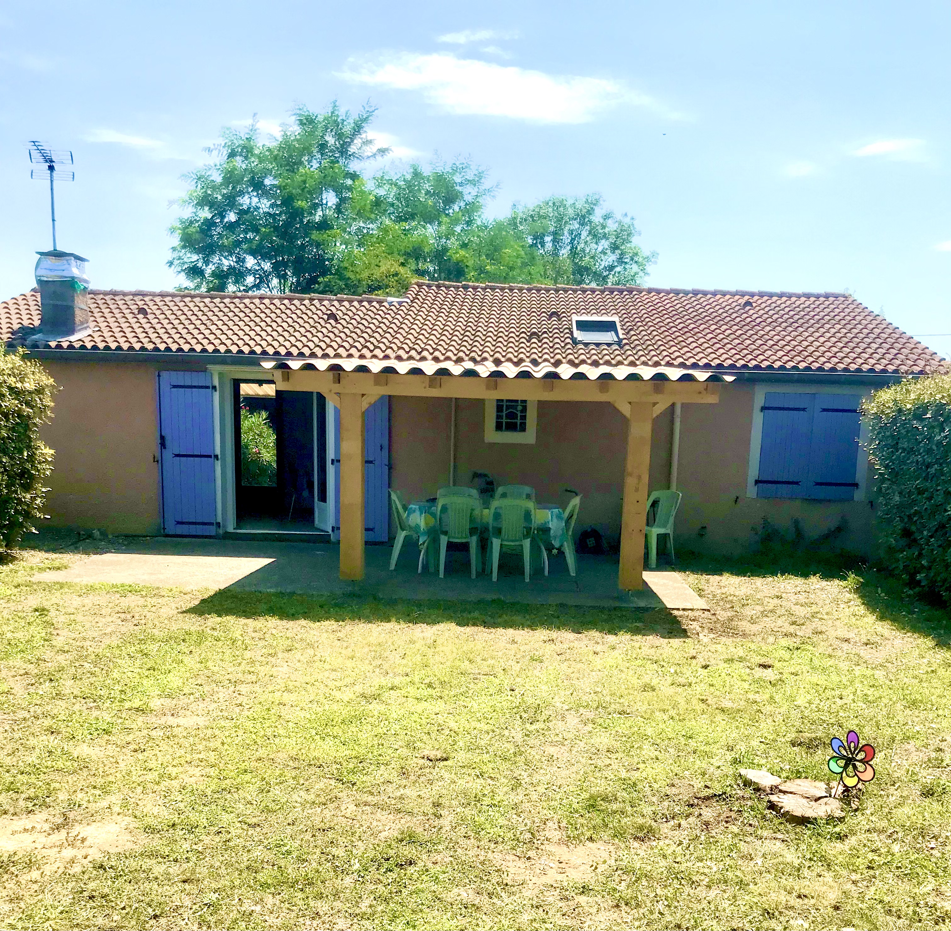 1500m2 arboré. Un jardin clôturé, tout plat. 2 terrasses en extérieur avec le mobilier de jardin, tonnelle. Transats à l’ombre des arbres. Barbecue.