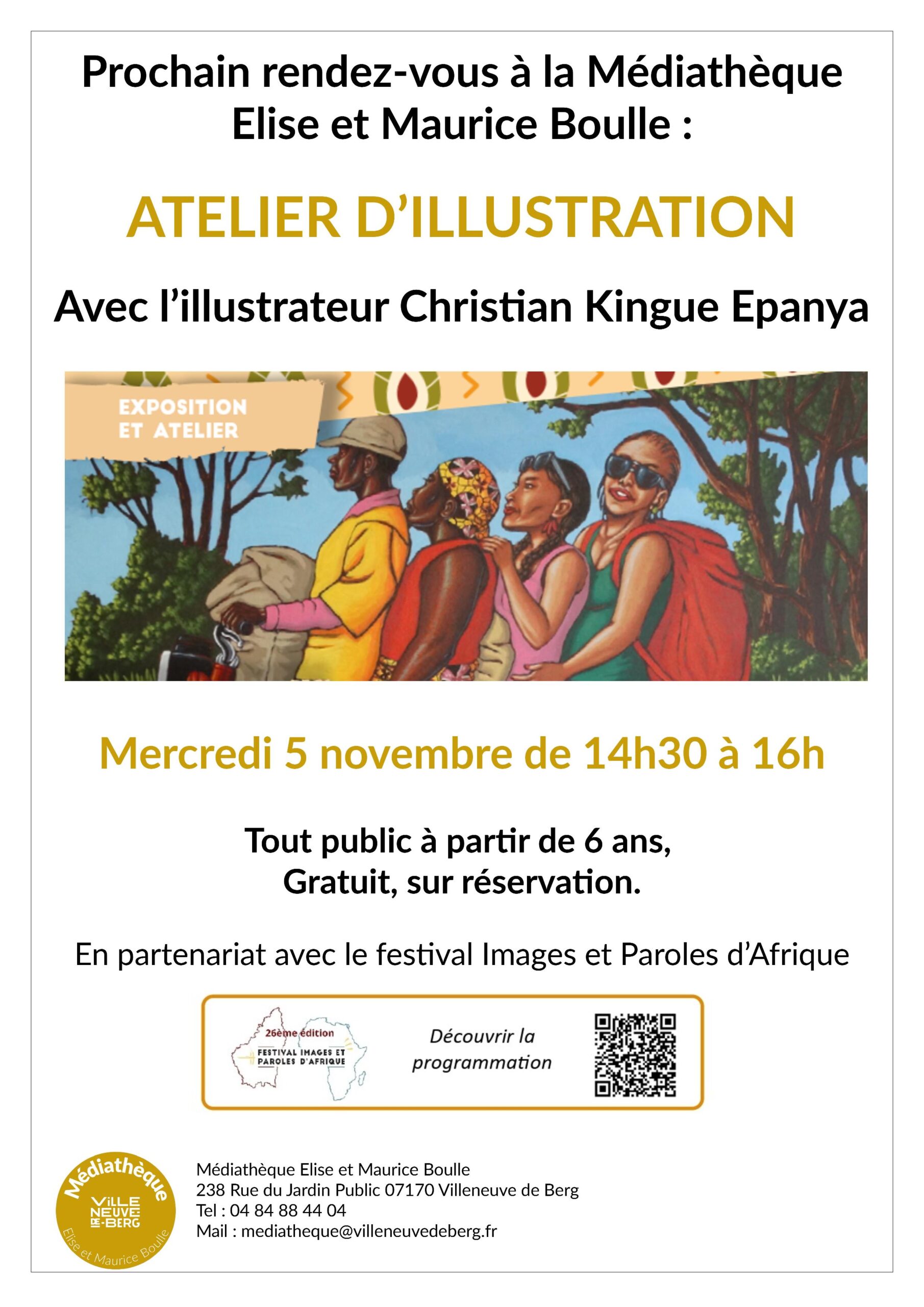 La médiathèque de Villeneuve de Berg vous propose un atelier d’illustration avec Christian Kingue Epanya. Tout public à partir de 6 ans. Sur réservation uniquement. Suivi d’une rencontre avec l’artiste ouverte à tous à 16h.